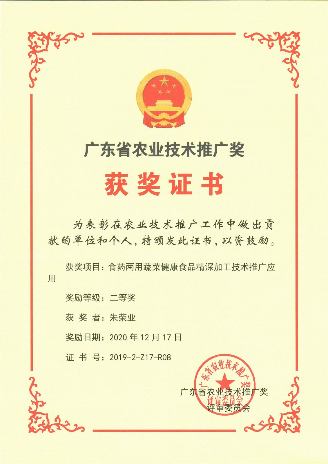 2020年12月,我司"食藥兩用蔬菜健康食品精深加工技術(shù)推廣應(yīng)用"項目榮獲“廣東省農(nóng)業(yè)技術(shù)推廣獎”二等獎。